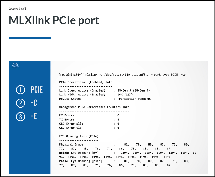 So this is how mlxlink PCIe port debug tool shows the detailed MRI Scan of that PCIe connector when queried. The command line basically saying “Look at the PCIe port (–port_type PCIE), tell me the counters (-c) and show me the Eye Diagram (-e)”